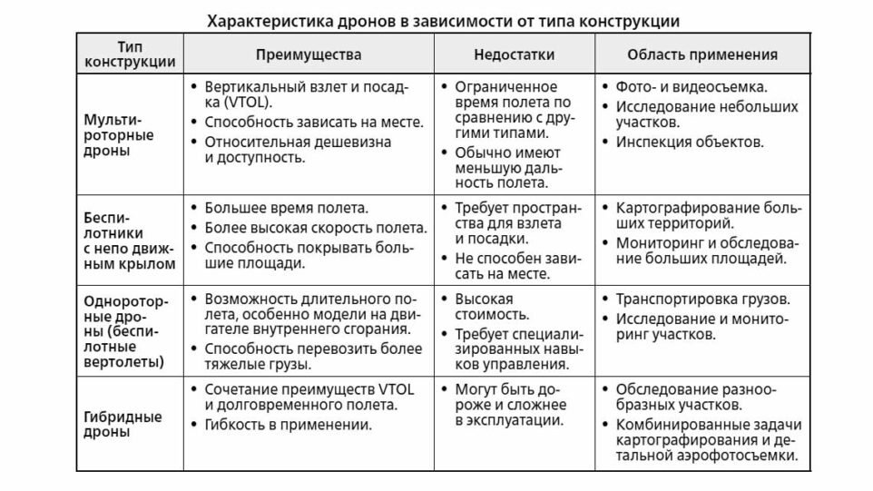 По разнообразию типа конструкции существует 4 основных типа беспилотных летательных аппаратов. Их характеристика представлена в таблице.