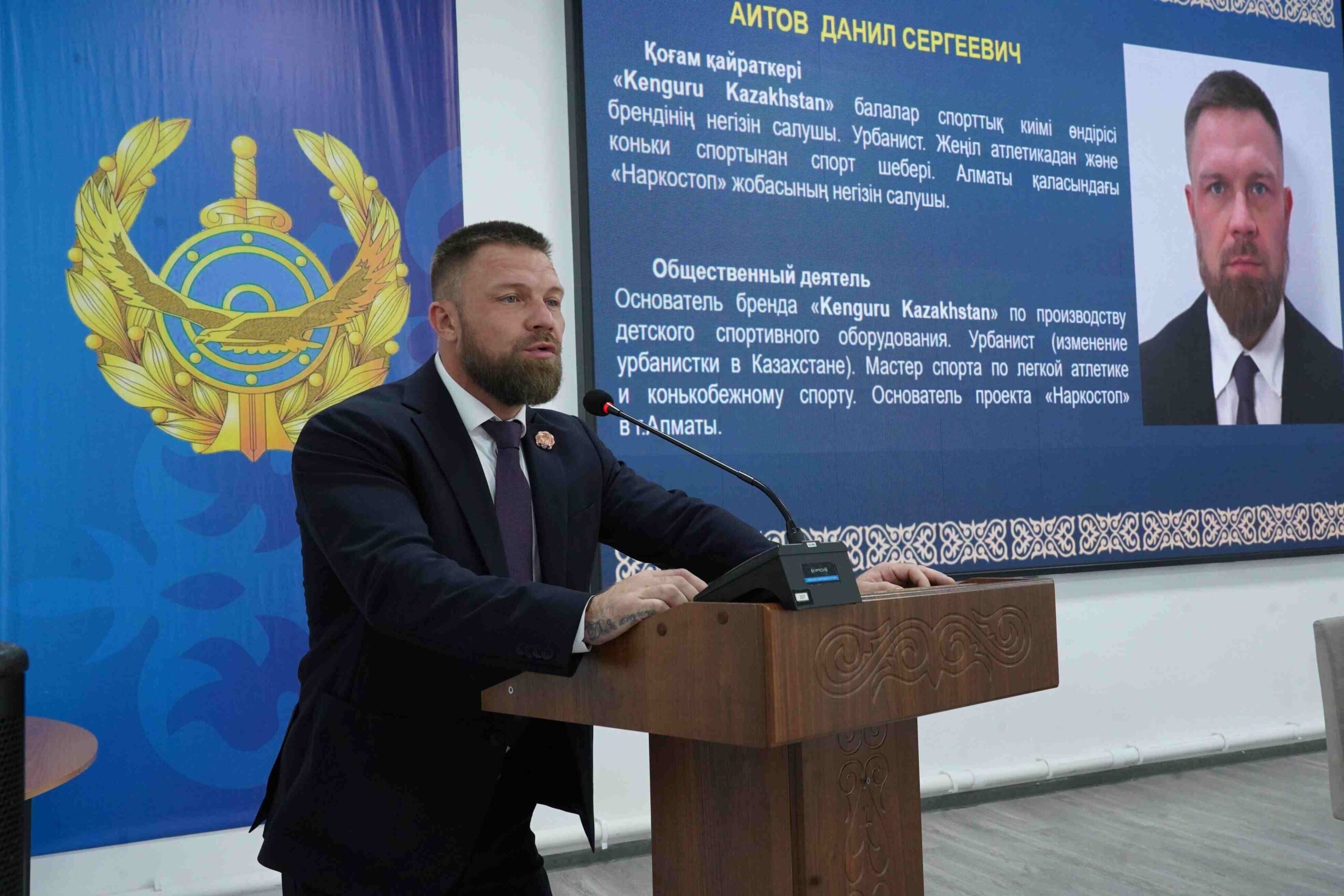 Одним из первых к курсантам обратился Данил Аитов —основатель бренда «Kenguru Kazakhstan» , урбанист, мастер спорта по легкой атлетике и конькобежному спорту, автор проекта «Наркостоп» в Алматы.