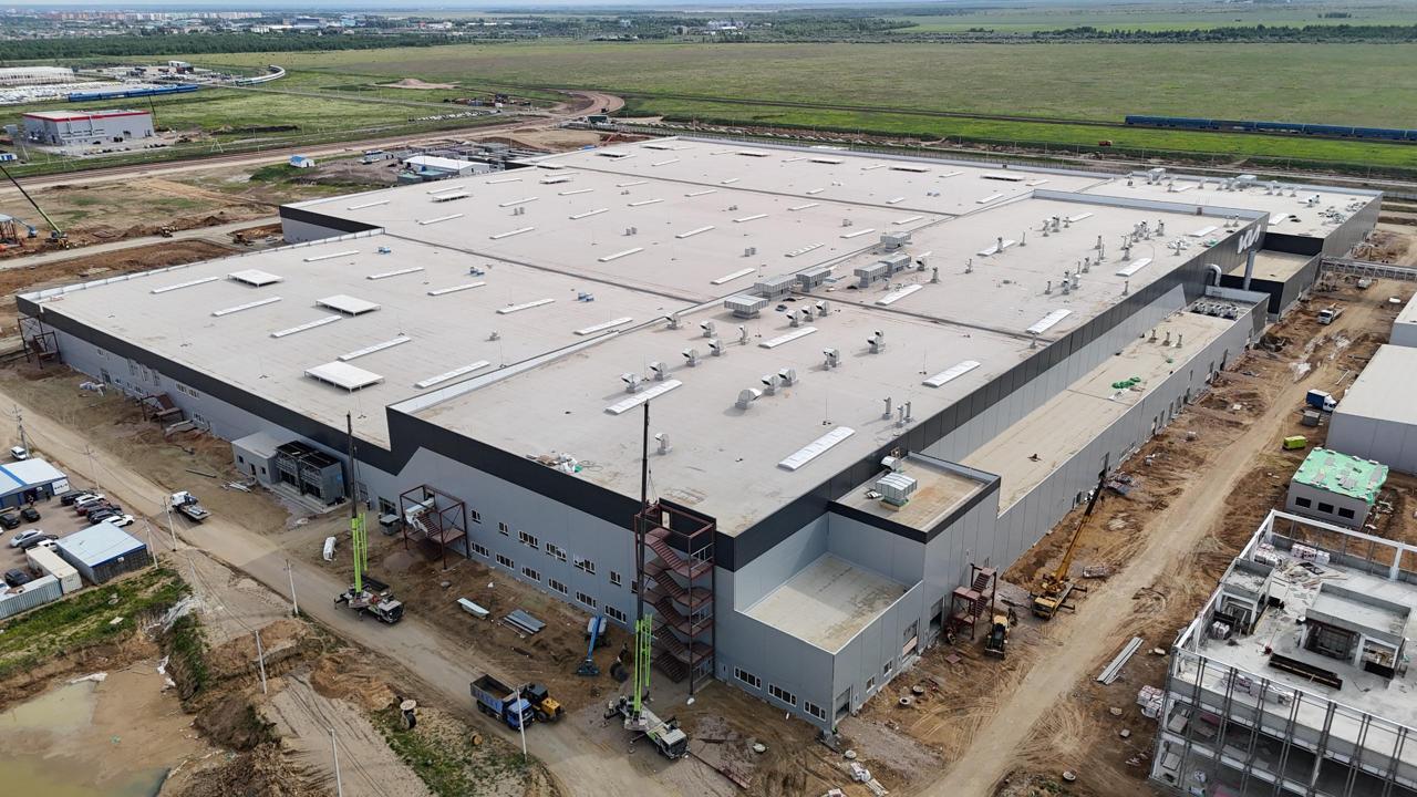 Құрылыс жұмыстары толық аяқталған. Металлоконструкциялар орнатылып, шатыр жабылған, сырты сэндвич-панельдермен қапталған. Оңтүстік Корея мен Қытайдан 800-ден астам контейнермен қажетті өндірістік жабдықтар жеткізілген.