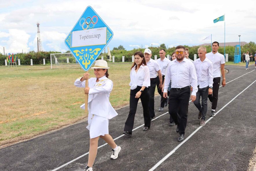 Далее вышли команды – всего приняло участие 10 сёл и сельских округов. Первыми шли бронзовые призёры районных летних Игр «Спартакиада-2024» – спортсмены Большевикского с\о. К слову, здесь гордятся своим земляком – Маратом Быстровым, мастером спорта по футболу, членом национальной сборной РК и игроком ФК «Ахмат» г. Грозный. Далее зрители приветствовали спортсменов Муктикольского с/о и чемпионов районной «Спартакиады-2024» – представителей села Забеловка.
