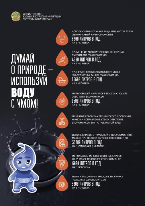 «Мы хотим донести до как можно большего числа людей важность экономии воды в быту. Вклад в сохранение водных ресурсов страны может внести каждый гражданин. Разработанные нашим министерством рекомендации показывают, что беречь воду очень легко, а итоговый результат действительно ощутимый. Теперь мы займемся активной информационной работой, чтобы о простых способах экономии воды узнали во всех уголках республики», – сообщил министр водных ресурсов и ирригации Нуржан Нуржигитов.