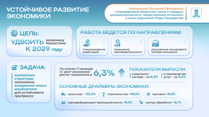 По итогам 2024 года целевой показатель по объему ВВП достигнут и составил 5%. В первой половине 2025 года показатели экономического развития страны заметно улучшились. Президент поставил перед Правительством амбициозную цель – удвоить экономику Казахстана к 2029 году. Работа в данном направлении продолжается, в том числе за счет стимулирования инвестиций, повышения производительности и расширения несырьевого сектора экономики.